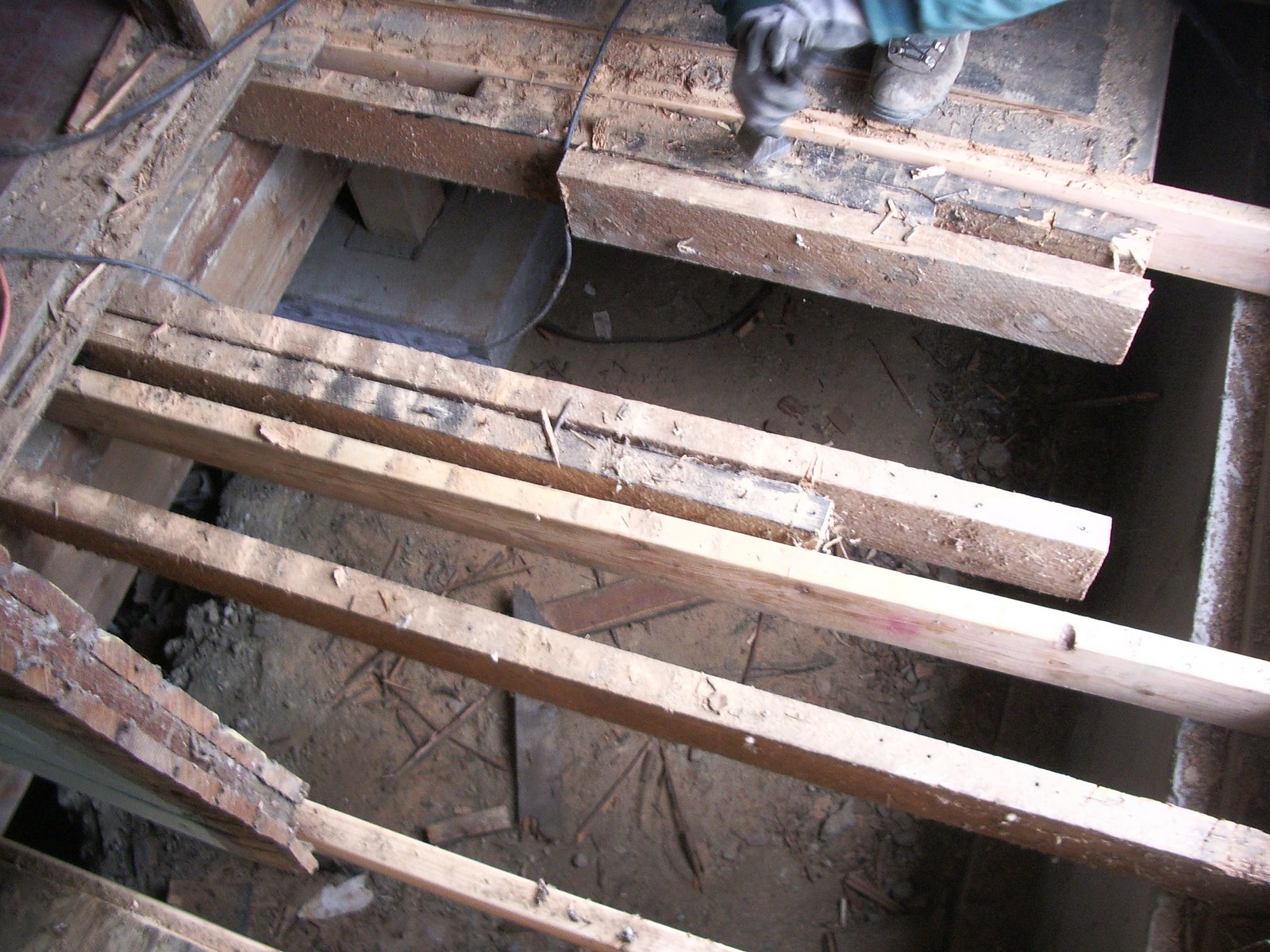 Above and below photo is the entryway opened up. There are the new beams on 2 foot centers and several of the old original beams that we had cut to put the chute under the house to fill the last cribbing hole.
